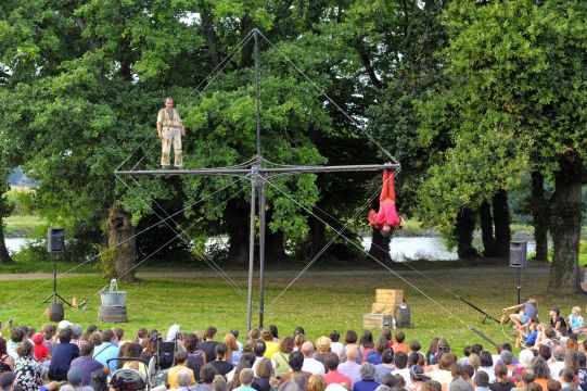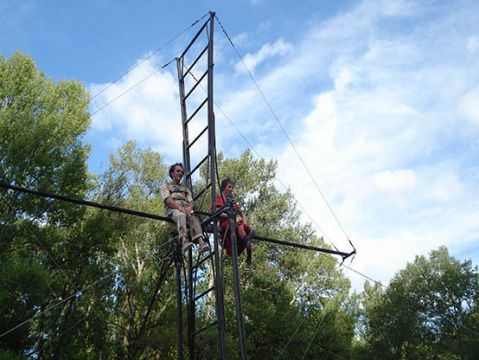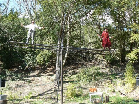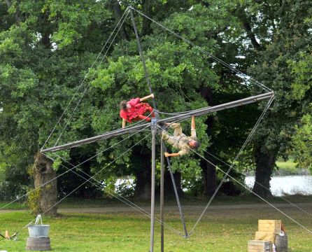 Bird-brained, Les Butors perform a high flying courtship, perched 7 meters above ground on a deliciously spectacular invention : a huge rotating ladder, a diabolical merry-go-round inspired by wind mills and Wheels of Death. Yielding three hundred and fifty kilo of scrap iron, cleverness, precision and gracefulness…