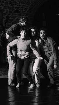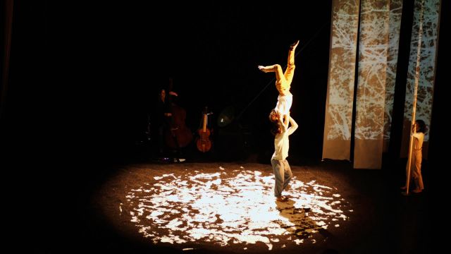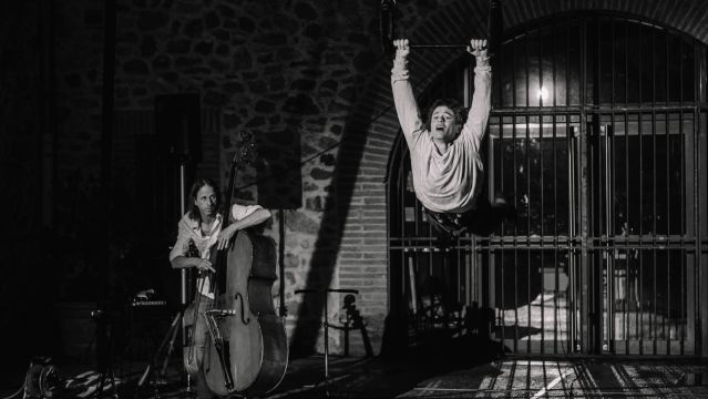 Mercredi 30 octobre 2024 - Salle de l'Union - Céret (66) : Avec: Colline Caen (trapèze), Ode Rosset (mât), Nelson Caillard (acrobate), Benoit Keller (musique et création sonore), Diogo Santos Farias (danse acrobatique), Diane Gossiôme (danse)
