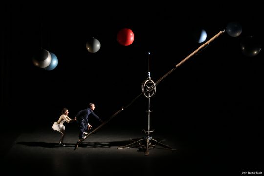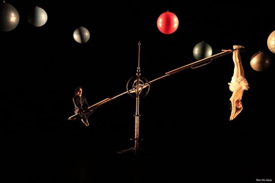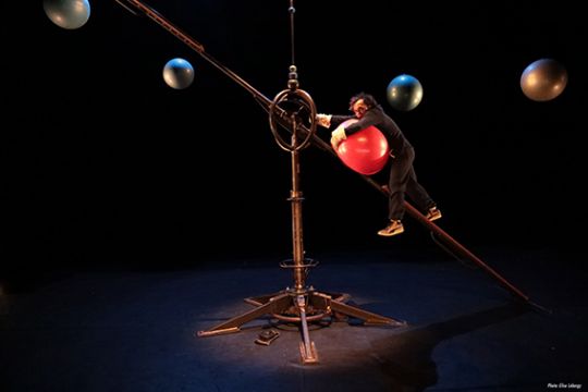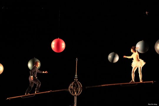 La compagnie Cirque Hirsute crée un manège enchanté dans l’espace. Autour de ballons colorés gros comme des planètes, le duo d’acrobates funambules tournoie et se joue de l’équilibre, dans une ambiance joyeuse et féerique. A voir en famille.