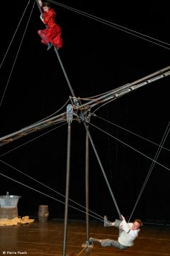 Ces drôles d’oiseaux se volent dans les plumes au cours d’un rituel saugrenu, enchaînant préliminaires aériens insolites, défis légèrement grivois, danses décalées, envols vertigineux et équilibres scabreux et funambulesques.