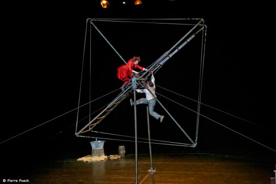 Avec leurs cervelles de piafs, les Butors se livrent à une parade amoureuse de haute voltige, perchés à 7 mètres de hauteur sur une invention délicieusement spectaculaire : une immense échelle rotatoire, un manège diabolique inspiré des moulins à vents et des roues de la mort. 350 kg de ferraille, de précision et de grâce…