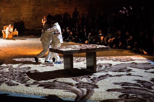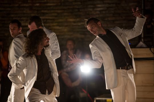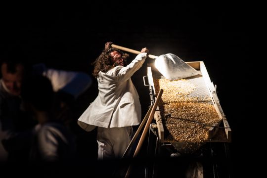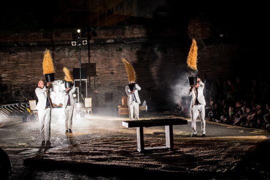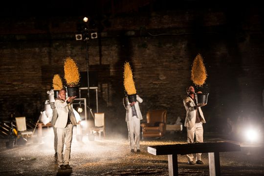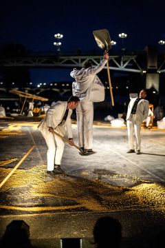 Dans The Baïna Trampa Frizt Fallen, création 2015, vous découvrirez comment faire danser des pelles à neige, la force du maïs comme matière à penser ou encore l’évolution singulière d’hommes en costume blanc dans un espace public transcendé.
