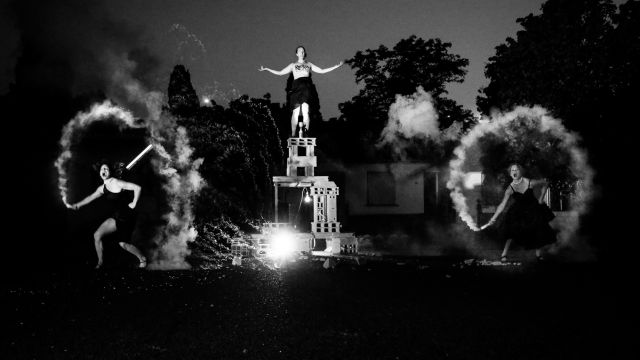 Année après année, Yaëlle Antoine, soucieuse de trouver les espaces qui correspondent à ses dramaturgies, se décloisonne et investit davantage des espaces urbains ou extérieurs : un quai, un parvis, un hall, des cours, la rue, des jardins, une église... C’est ce champ d'exploration qu’elle creuse avec la création de Liesse(s) qui interroge la questions des rituels, empruntant une esthétique foutraque et carnavalesque. Liesse(s) est crée, avec les moyens du bord, en 2021, en pleine pandémie.